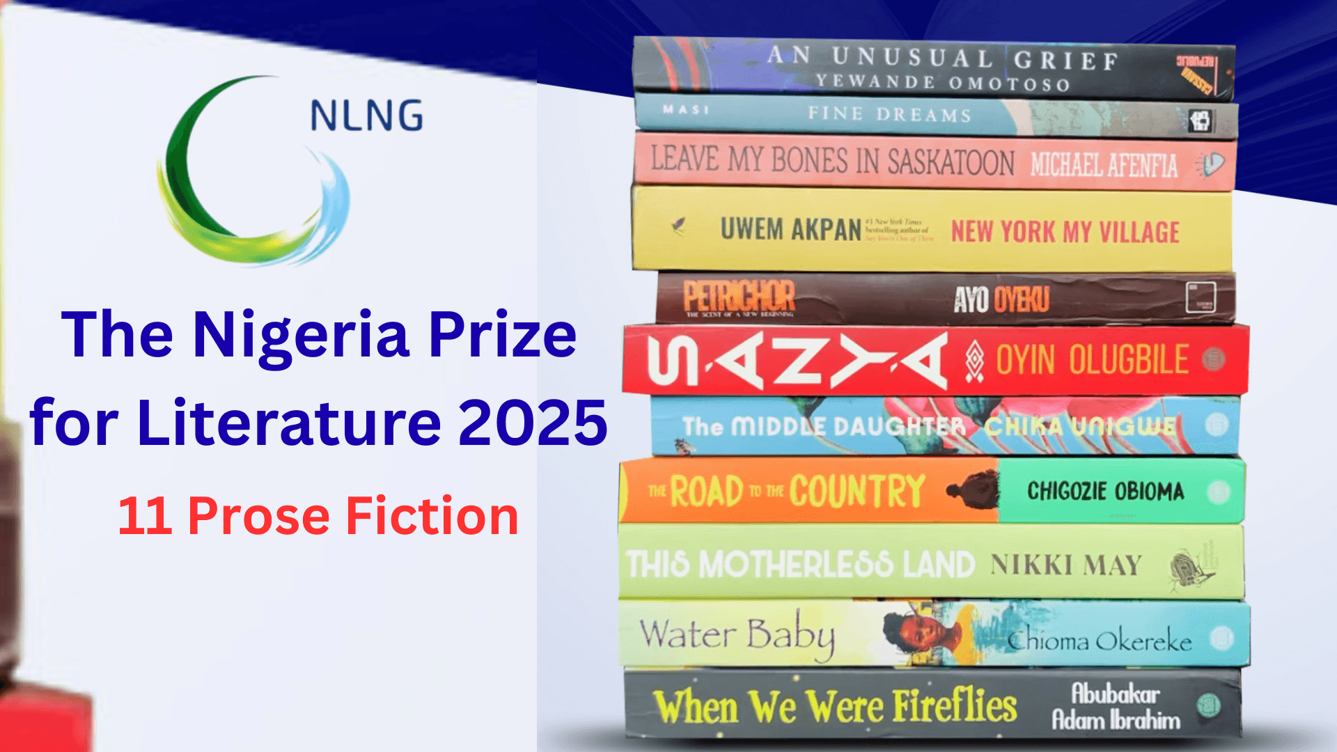 The longlist of 11 remarkable titles contending for the 2025 edition of The Nigeria Prize for Literature, featuring works such as An Unusual Grief by Yewande Omotoso, New York, My Village by Uwem Akpan, The Middle Daughter by Chika Unigwe, and The Road to the Country by Chigozie Obioma.